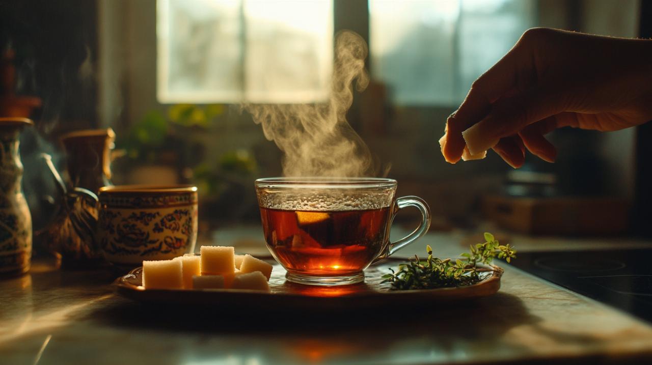 La conservation du thé en vrac mérite également une attention particulière. Exposé à l'air, à la lumière ou à l'humidité, le thé noir perd rapidement ses qualités aromatiques et développe un goût éventé. Stockez-le dans une boîte hermétique, à l'abri de la chaleur et des odeurs fortes qui pourraient l'imprégner. Enfin, résistez à la tentation d'ajouter le sucre directement dans la casserole pendant l'infusion, car cette pratique modifie la structure moléculaire du thé et altère son profil gustatif. Préférez sucrer individuellement chaque tasse, permettant ainsi à chacun d'apprécier le thé selon ses goûts personnels tout en préservant l'intégrité de la préparation initiale.